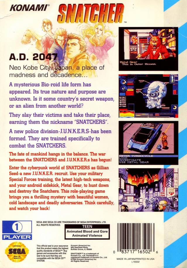 50년 후, '스내처(snatchers)'라고 알려진 인공 생명체 또는 바이오로이드(bioroids) 종이 인공 섬인 네오 고베 시티에 나타나기 시작했습니다. 이들은 희생자를 살해하고 그들의 신분으로 사회에 숨어듭니다. 그들이 정확히 무엇인지, 어디서 왔는지는 아무도 모릅니다. 플레이어는 기억상실증에 걸린 채 대(對)스내처 수사대 'J.U.N.K.E.R.'에서 일하는 길리언 시드(Gillian Seed)가 되어, 스내처의 근원을 추적하고 길리언과 스내처 사이에 얽힌 미스터리한 연결고리를 밝혀내야 합니다.