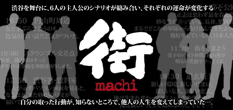 『428 ~봉쇄된 시부야에서~(Machi)』는 일본 도쿄 시부야를 배경으로, 각기 다른 고민과 목적을 가진 8명의 주인공이 얽히고설킨 이야기를 다룹니다. 게임은 총 5일간의 사건을 다루며, 방대한 양의 실사 사진을 통해 스토리가 전개됩니다. 주인공들은 고등학생 플레이보이, 게임 오타쿠 경찰관, 무명 배우, 전직 야쿠자, TV 드라마 작가 등 매우 다양합니다. 각 주인공의 이야기는 장르조차 넘나들 정도로 개성이 뚜렷하여, 어떤 이야기는 유쾌한 코미디인 반면 어떤 이야기는 어둡고 불길한 분위기를 자아냅니다.