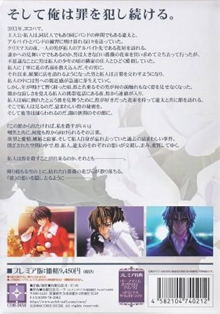 이 이야기의 주인공 타쿠토는 부모님을 여읜 후 친구 료타와 함께 살고 있습니다. 그는 동네 꽃집에서 아르바이트를 하던 중, 어느 날부터인가 하이시마 코우라는 의문의 남자가 찾아와 거의 매일 흰 장미를 사 가는 것을 보게 됩니다. 타쿠토와 그는 서로 가까워지지만, 타쿠토는 동료의 실종과 같이 하이시마와 어떻게든 연관되어 있는 이상한 사건들이 벌어지고 있음을 깨닫습니다. 어느 날, 그는 하이시마의 저택으로 장미를 배달하기로 결심하고, 료타가 그를 따라나섭니다.