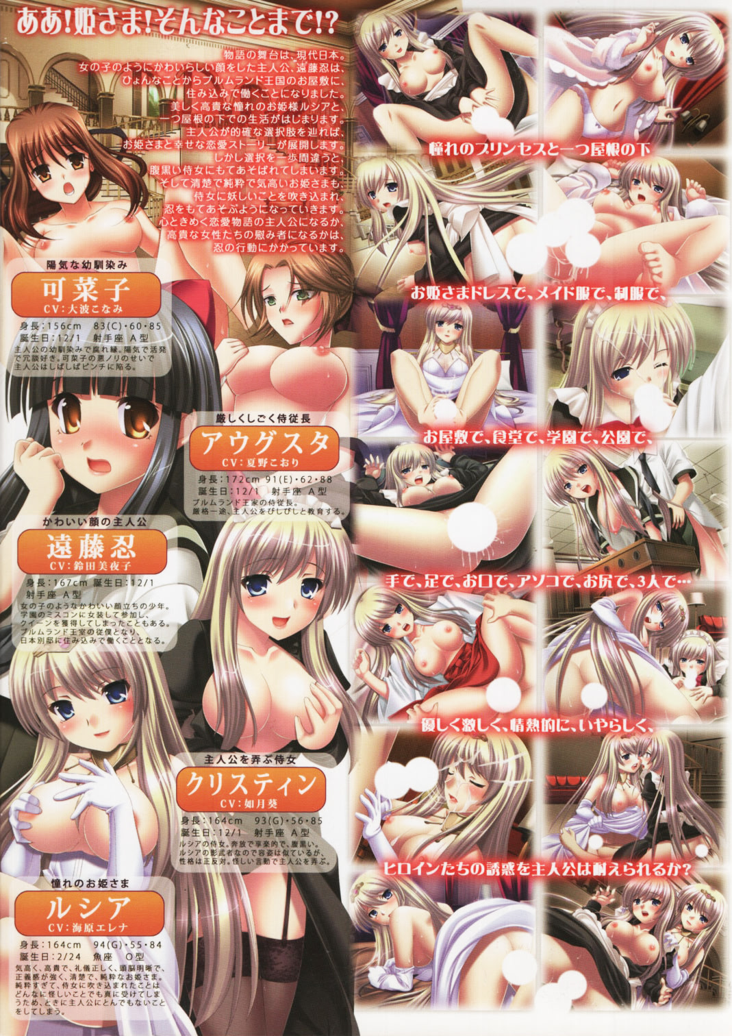 루시아는 남자를 좋아하지 않지만, 점차 시노부의 귀여운 얼굴에 이끌리게 됩니다. 시노부가 올바른 선택을 한다면 그녀와 행복한 삶을 누릴 수 있겠지만, 실수를 저지른다면 입주 가정부인 크리스틴에게 속아 넘어가고, 루시아마저 그와 함께 노는 장난감으로 전락하게 될 것입니다. 그가 행복한 러브 스토리의 주인공이 될지, 아니면 소녀들의 장난감이 될지는 모두 시노부에게 달려 있습니다...