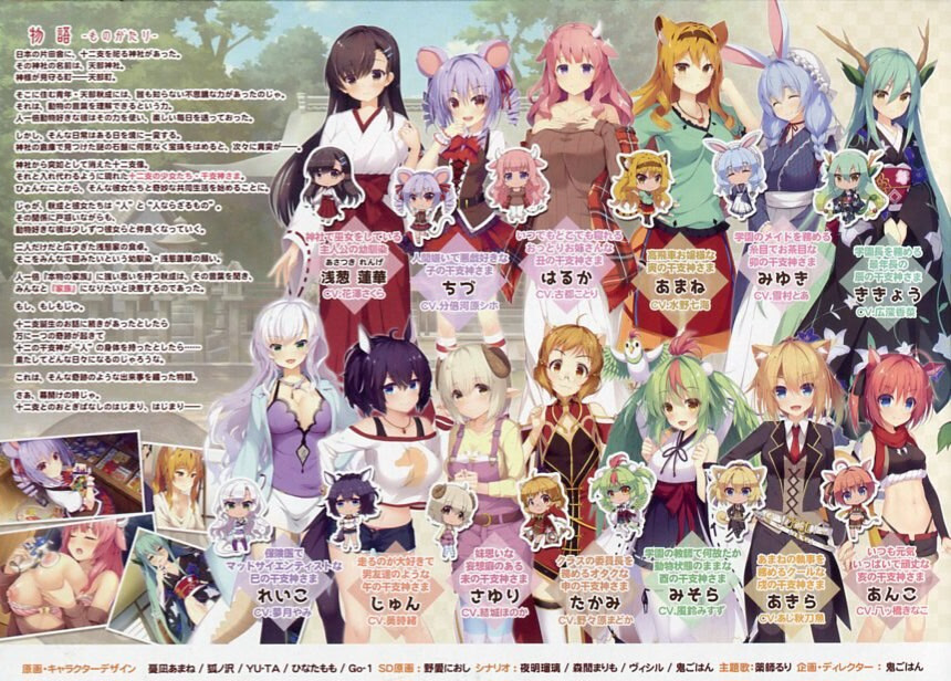 하지만 어느 날, 신사 창고에 있던 수수께끼의 석판에 무심코 귀중한 구슬을 끼워 넣으면서 그의 일상은 뒤바뀌고 말았습니다. 십이지신 석상들이 갑자기 사라지고, 그 자리에 십이지신인 열두 소녀 '에토가미'들이 나타난 것입니다. 예상치 못한 사건들로 인해 함께 살게 된 소녀들과 아키나리는 동물을 사랑하는 그의 천성 덕분에 금세 좋은 친구가 되었습니다.