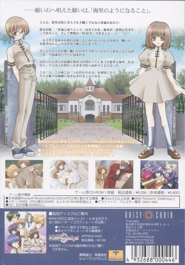 열혈 야오이 팬걸인 주인공 유리는 쌍둥이 남동생 카이리만큼 잘생기지 못했다는 사실에 잔뜩 화가 나 있습니다. 그러던 중 둘은 소원을 들어주는 돌을 발견하고, 유리는 섹시한 미남이 되게 해달라고 빌며 돌을 집어 들지만, 실수로 돌을 떨어뜨려 깨뜨리고 맙니다. 약 18일 후인 9월 1일, 카이리와 함께 새로운 학교생활을 시작하게 된 유리는 어느 날 아침 침대 위에서 깨졌던 돌이 다시 온전한 상태로 놓여 있는 것을 발견합니다. 유리가 돌에 손을 대자, 남매의 몸이 서로 뒤바뀌고 맙니다. 여자가 된 것을 별로 달가워하지 않는 남동생과는 달리, 주인공 유리는 미소년이 되어 남자들과 야오이 같은 상황을 즐길 생각에 들뜹니다. 몸이 바뀌는 현상은 나타났다 사라졌다를 반복하고, 그렇게 쌍둥이의 모험이 시작됩니다!