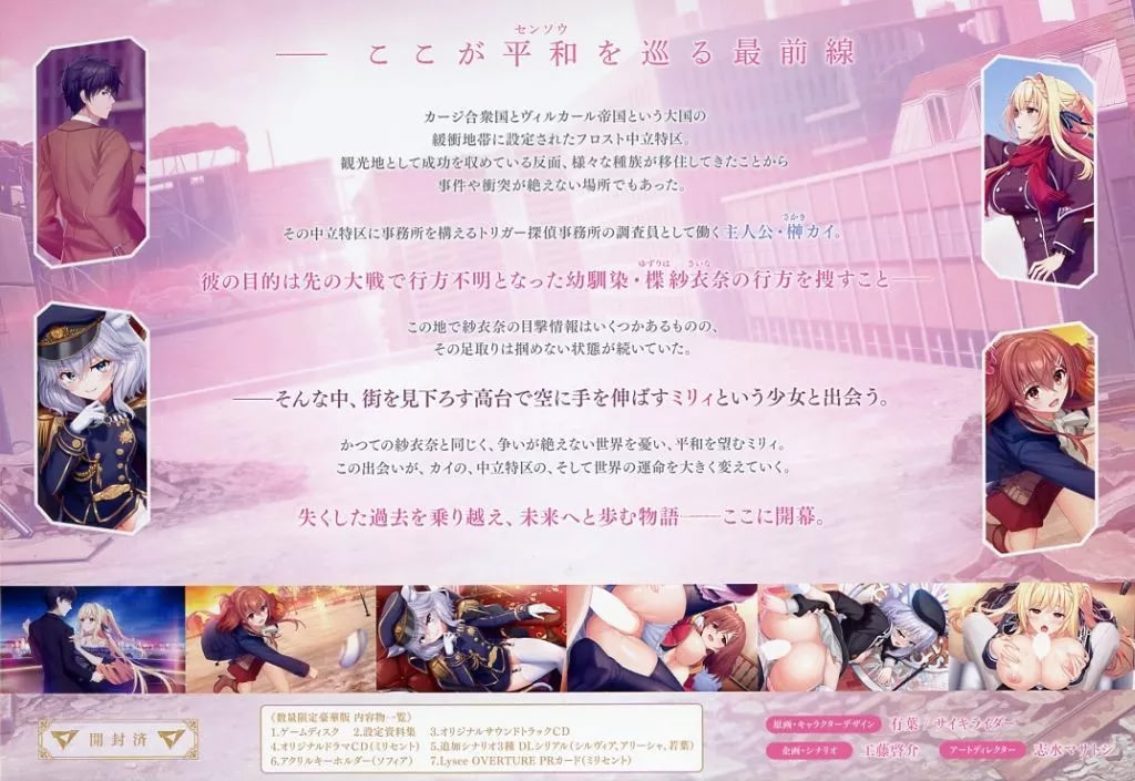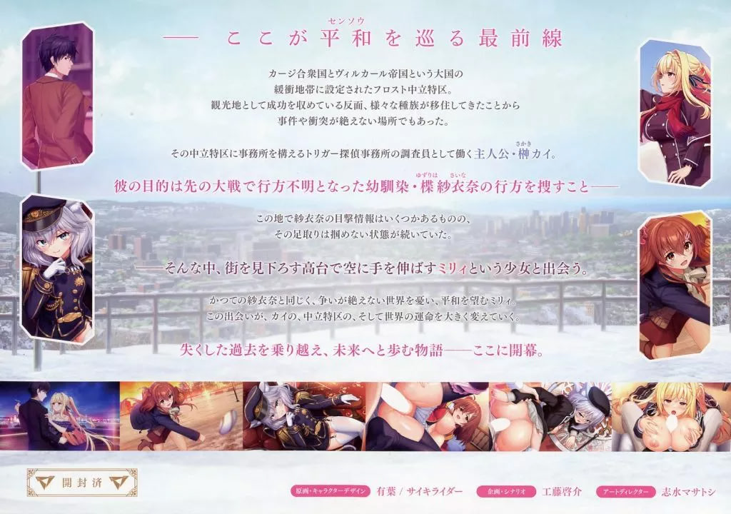 주인공 사카키 카이(Sakaki Kai)는 이 중립 지대에 위치한 '트리거 탐정 사무소'의 조사원이다. 그의 임무는 지난 대전쟁 중에 행방불명된 소꿉친구 유즈리하 사이나(Yuzuriha Saina)를 찾는 것.