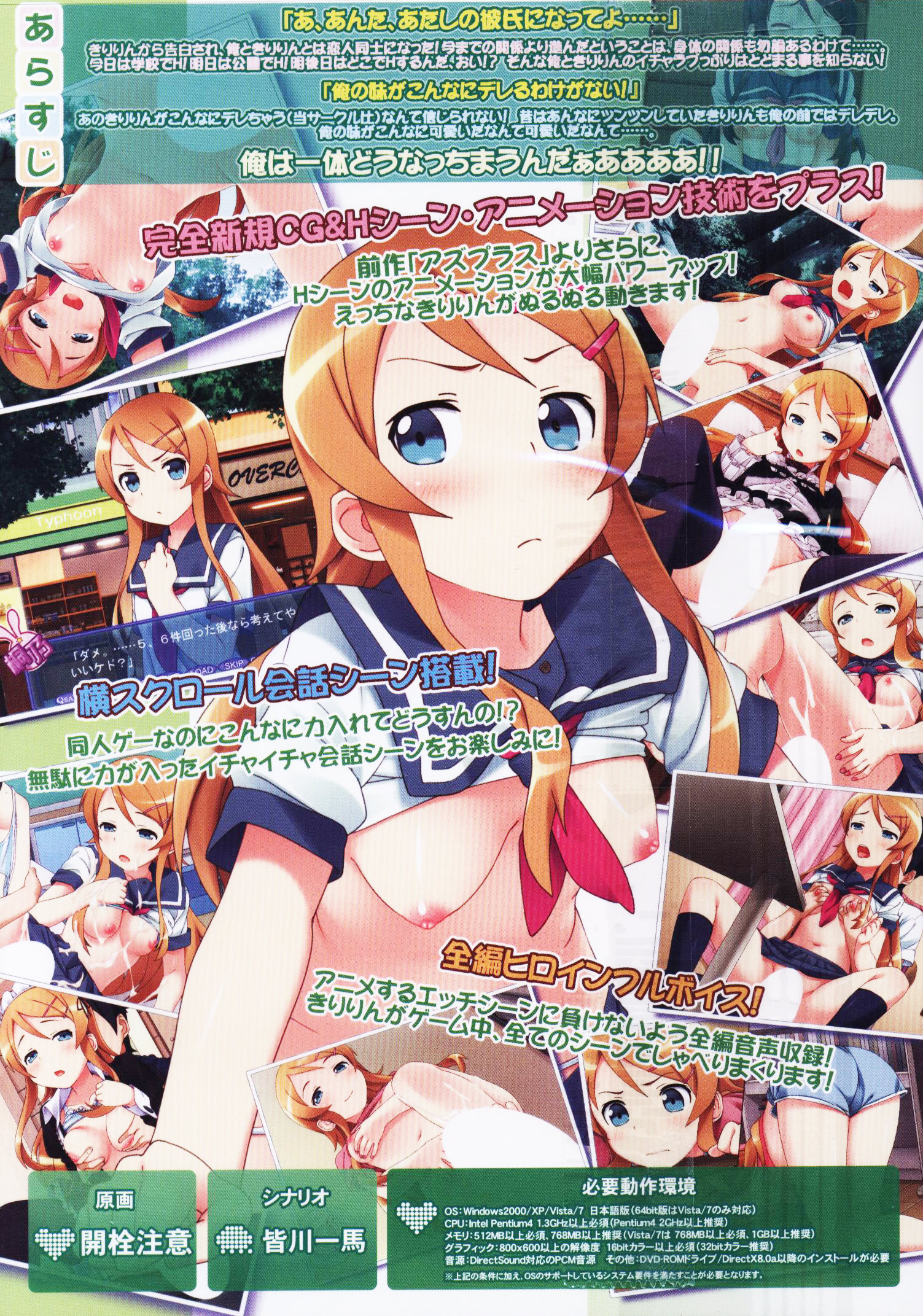 동인 소프트 서클 Grand Cross가 제작한 이 에로틱 연애 시뮬레이션 패러디 작품에서 키리노의 남자친구가 되어보세요! 애니메이션에서 바로 튀어나온 듯한 완벽한 작화와 함께, 키리노 및 다른 '내여귀(Oreimo)' 히로인들과의 애니메이션 H신을 즐겨보세요. 코스프레 섹스, 야외 섹스, 풋플레이, 교복 섹스 등 초섹시한 시나리오가 가득 준비되어 있습니다.
