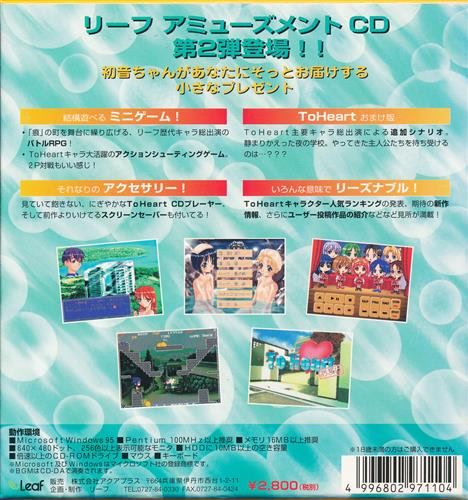 '하츠네의 내정(Hatsune no Naishou)'은 Leaf 팬이라면 절대 놓쳐서는 안 될 Leaf의 미니 게임 모음집입니다. 이 CD에는 미니 게임, 화면 보호기, 배경화면, CD 플레이어를 포함한 여러 가지 귀여운 미니 소프트웨어가 담겨 있습니다. CD에 수록된 미니 게임으로는 'To Heart' 캐릭터들이 등장하는 미니 액션 게임 'Heart By Heart', 미니 RPG 게임 'Leaf Fighting 97', 'To Heart 오마케', 그리고 물론 어드벤처 게임인 '하츠네의 내정'이 있습니다.