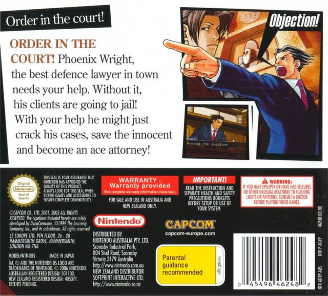 플레이어 캐릭터는 Phoenix Wright입니다. 그는 첫 번째 게임 시점에서 로스쿨을 갓 졸업한 신입 변호사로, 과거 그를 살인 혐의에서 무죄 방면하도록 도와주었던 변호사 Mia Fey가 운영하는 Fey & Co. Law Offices에 입사합니다. Mia가 살해당하자 Wright는 그녀의 여동생인 Maya Fey의 도움을 받아 사무소를 물려받고, 사무소 이름을 "Wright & Co. Law Offices"로 변경합니다. Fey 가문은 영혼을 불러내는 능력이 있으며, 이를 통해 Maya는 때때로 Mia의 영혼을 불러내 법정에서 Wright를 돕기도 합니다. Wright는 법정에서 대립하는 검사 Miles Edgeworth와 라이벌 관계를 형성합니다...